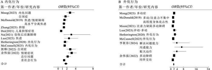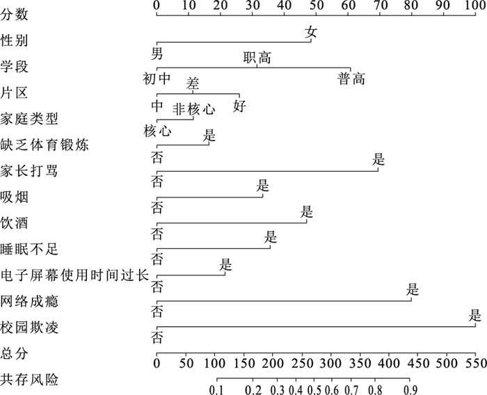 Objective To understand the current situation and influencing factors of comorbidity of depressive and anxiety symptoms among middle school students in Chongqing, so as to provide a scientific basis for formulating a comprehensive strategy for the co-prevention of multiple diseases among middle school students. Methods From September to December 2024, 12 327 middle school students were selected from 6 districts and counties in Chongqing by the combination of stratified cluster sampling and convenience sampling method. The current status of depressive and anxiety symptoms was investigated by using the Center for Epidemiological Survey-Depression Scale (CES-D) and the Generalized Anxiety Disorder-7 (GAD-7). The Chi-squared test was used to compare the differences between groups with comorbidity of depressive and anxiety symptoms, multivariate Logistic regression analysis was used to analyze its related factors, and a nomogram prediction model was drawn. Results The detection rates of depressive symptoms, anxiety symptoms and comorbidity among middle school students in Chongqing were 26.34%, 34.55% and 21.16%, respectively. Among them, the detection rates of the three types of symptoms in girls (29.80%, 40.99%, 25.15%) were all higher than those in boys (23.22%, 28.73%, 17.55%) (χ2=68.61, 204.23, 106.51, all P < 0.01). Statistical significance was observed in the distribution of depressive and anxious symptoms among middle school students across different gender, academic stage, school district, family type, physical activity levels, parental discipline, smoking, alcohol consumption, sleep deprivation, excessive screen time, Internet addiction, and bullying (χ2=14.49-991.46, all P < 0.01). Multivariate Logistic regression analysis showed that compared with junior high school students, ordinary high school students had a higher risk of comorbidity (OR=2.71, 95%CI=2.41-3.05); girls (OR=2.17, 95%CI=1.95-2.40), non-core family (OR=1.20, 95%CI=1.08-1.32), and good neighborhood (OR=1.16, 95%CI=1.02-1.30), campus bullying (OR=4.88, 95%CI=4.32-5.50), Internet addiction (OR=4.77, 95%CI=3.41-6.68), parental beating and scolding (OR=3.18, 95%CI=2.72-3.71), alcohol consumption (OR=2.10, 95%CI=1.86-2.37), and insufficient sleep (OR=1.73, 95%CI=1.54-1.95) had higher risks with comorbidity of depression and anxiety symptoms (all P < 0.05). A nomogram prediction model was constructed based on significant variables shows that C-index=0.75 (AUC=0.75, 95%CI=0.74-0.76, P < 0.05), and the model had good predictive performance. Conclusions The current situation of comorbidity of depressive and anxiety symptoms among middle school students in Chongqing is not optimistic. The nomograms can be used to effectively predict the risk of comorbidity of depressive and anxiety symptoms in middle school students.